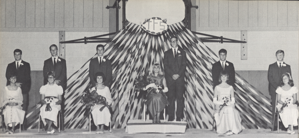 1969 TFS Postscript Yearbook p008Activities | Fleurs de Paris Prom | More Prom | 1968 Homecoming PDF | Homecoming Dance | Guys and Dolls | On Stage |![]() 1968 Homecoming Court and escorts: Chris Beres, Bud Jenkins, Carol Mizanin. Harry Smith, 1967 Queen Debbie Cable. Rich Krilich, 1968 Queen Diane Watts, Lettermen's Club president, Chuck Haddock, Donna Torgerson, Dick Weber, Judy Gasquoine, Len Rompca. |