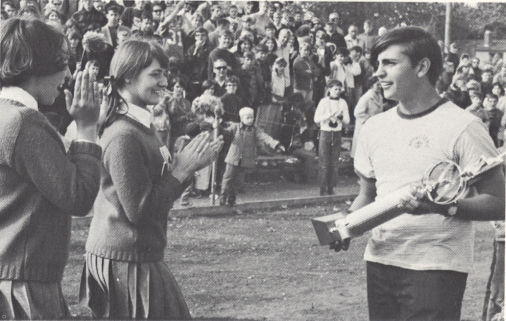 Triumphant, the Soph, class officers are awarded the trophy for the best float. |