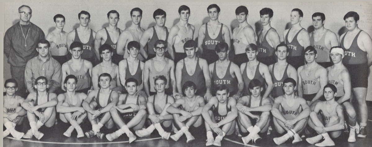 Varsity Wrestling: bottom row, left to right: Steve McGilvery, Dave Junker, Dan LeMonier, Dan White, Norman Klein, Gerry Kohlenberger, Tim Gavin, Larry Szulczewski, Rich Browne, Rod Maravilla, George Nadasdy. Row 2: Roger LaFollette, mgr., Ron Diamond, Edward Murphy, Steve Archambault, Martin Murrin, Bob Starks, Tom Economous, Michael Warfel, Edward Kubic, Tony Nadasdy, John Pranger. Row 3: Coach Sowinski, Randy Whyle, Ken Mueller, Arvidas Jarasius, Rich Ebbens, Paul Barcley, Owen Watterson, unknown, Andy Tepavcevich, Mike Dohl, Kevin Baldwin, Bud Jenkins, James Palicke.