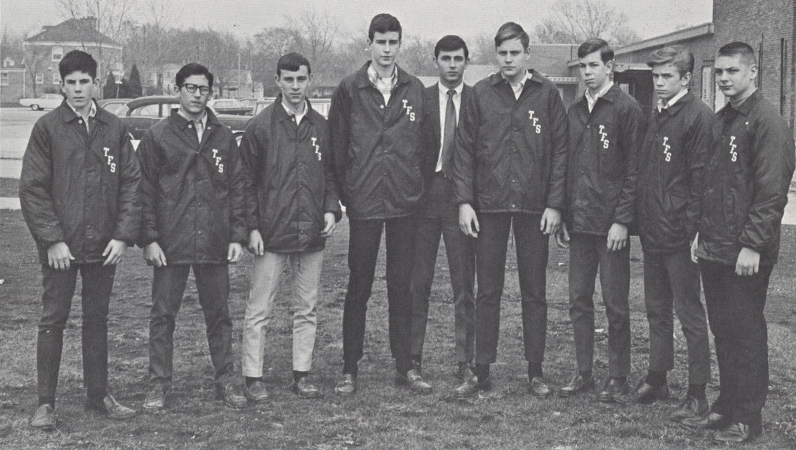 Varsity Golf Team - From left to right: Brint Brinkman, Jack Wiers, Bill George, John Nesovic, Ron Hanchar, Bruce Cap, Mark Kingdom, Coach DeSoto.