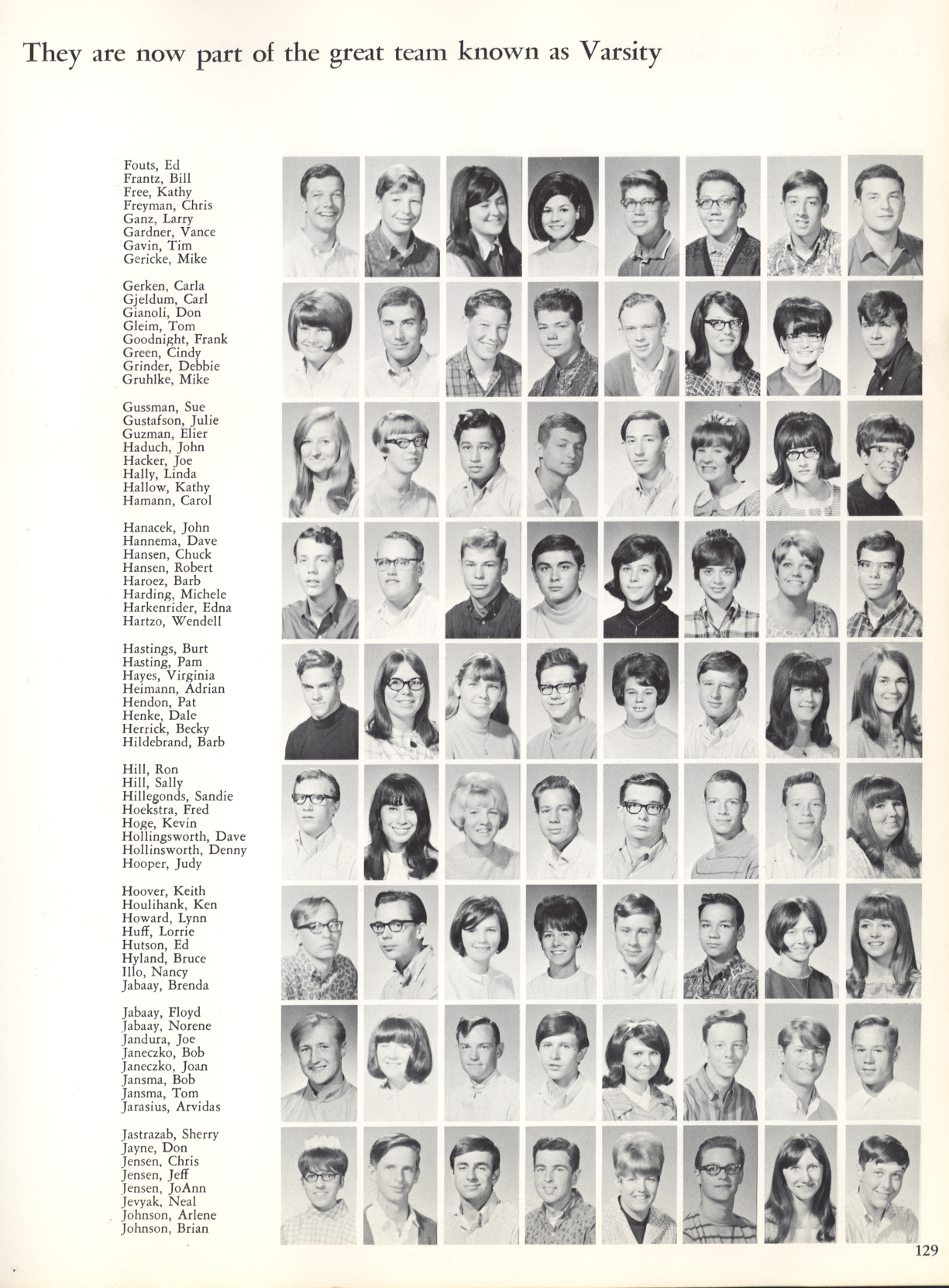 Caption(s) on p129: THEY ARE NOW PART OF THE GREAT TEAM KNOWN AS VARSITY Q129, Juniors-Fouts-Johnson Fouts, Ed Frantz, Bill Free, Kathy Freyman, Chris Ganz, Larry Gardner, Vance Gavin, T im Gericke, Mike Gerken, Carla Gjeldum, Carl Gianoli, Don Gleim, Tom Goodnight, Frank Green, Cindy Grinder, Debbie Gruhlke, Mike Gussman, Sue Gustafson, Julie Guzman, Elier Haduch, John Hacker, Joe Hally, Linda Hallow, Kathy Hamann, Carol Hanacek, John Hannema, Dave Hansen, Chuck Hansen, Robert Haroez, Barb Harding, Michele Harkenrider, Edna Hartzo, Wendell Hastings, Burt Hasting, Pam Hayes, Virginia Heimann, Adrian Hendon, Pat Henke, Dale Herrick, Becky Hildebrand, Barb Hill, Ron Hill, Sally Hillegonds, Sandie Hoekstra, Fred Hoge, Kevin Hollingsworth, Dave Hollinsworth, Denny Hooper, Judy Hoover, Keith Houlihank, Ken Howard, Lynn Huff, Lorrie Hutson, Ed Hyland, Bruce Ho, Nancy Jabaay, Brenda Jabaay, Floyd Jabaay, Norene Jandura, Joe Janeczko, Bob Janeczko, Joan Jansma, Bob Jansma, Tom Jarasius, Arvidas Jastrazab, Sherry Jayne, Don Jensen, Chris Jensen, Jeff Jensen, JoAnn Jevyak, Neal Johnson, Arlene Johnson, Brian