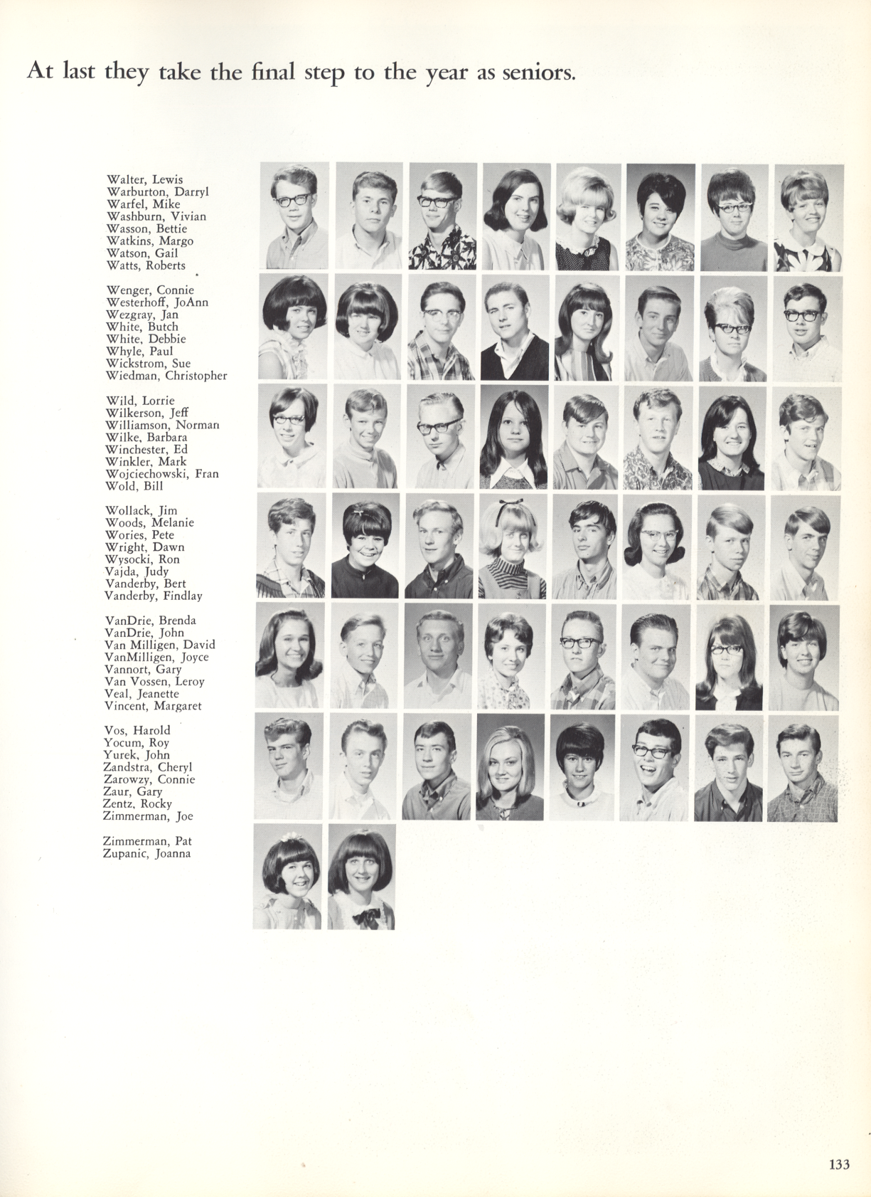 Caption(s) on p133: AT LAST THEY TAKE THE FINAL STEP TO THE YEAR AS SENIORS. Q133, Juniors-Walter-Zuipanic Walter, Lewis Warburton, Darryl Warfel, Mike Washburn, Vivian Wasson, Bettie Watkins, Margo Watson, Gail Watts, Roberts Wenger, Connie Westerhoff, JoAnn Wezgray, Jan White, Butch White, Debbie Whyle, Paul Wickstrom, Sue Wiedman, Christopher Wild, Lorrie Wilkerson, Jeff Williamson, Norman Wilke, Barbara Winchester, Ed Winkler, Mark Wojciechowski, Fran Wold, Bill Wollack, Jim Woods, Melanie Wories, Pete Wright, Dawn Wysocki, Ron Vajda, Judy Vanderby, Bert Vanderby, Findlay VanDrie, Brenda VanDrie, John Van Milligen, David VanMilligen, Joyce Vannort, Gary Van Vossen, Leroy Veal, Jeanette Vincent, Margaret Vos, Harold Yocum, Roy Yurek, John Zandstra, Cheryl Zarowzy, Connie Zaur, Gary Zentz, Rocky Zimmerman, Joe Zimmerman, Pat Zupanic, Joanna 133