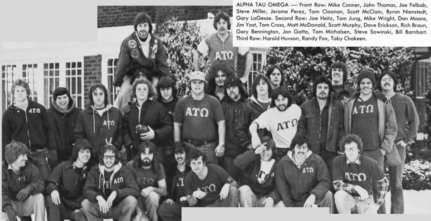 ALPHA TAU OMEGA — Front Row: Mike Conner, John Thomas, Joe Felbab, Steve Miller, Jerome Perez, Tom Cloonan, Scott McClain, Byron Nienstedt, Gory LaGesse, Second Row: Joe Heitz, Torn Jung, Mike Wright, Dan Moore, Jim Yost, Tom Cross, Matt McDonald, Scott Murphy, Dove Erickson, Rich Braun, Gary Bennington, Jon Gatto, Torn Michalsen, Steve Sowinski, Bill Barnhart. Third Row: Harold Huvson, Randy Fox, Toby Chakeen.