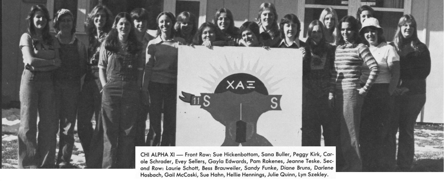 CHI ALPHA XI — Front Row: Sue Hickenbonom, Sana Buller, Peggy Kirk, Carole Schrader, Evey Sellers, Gayla Edwards, Pam Rokenes, Jeanne Teske. Second Row: Laurie Schott, Bess Bravweiter, Sandy Funke, Diane Bruns, Darlene Hosbach, Gail McCoski, Sue Hahn, Nellie Henning, Julie Quinn, Lyn Szekley.
