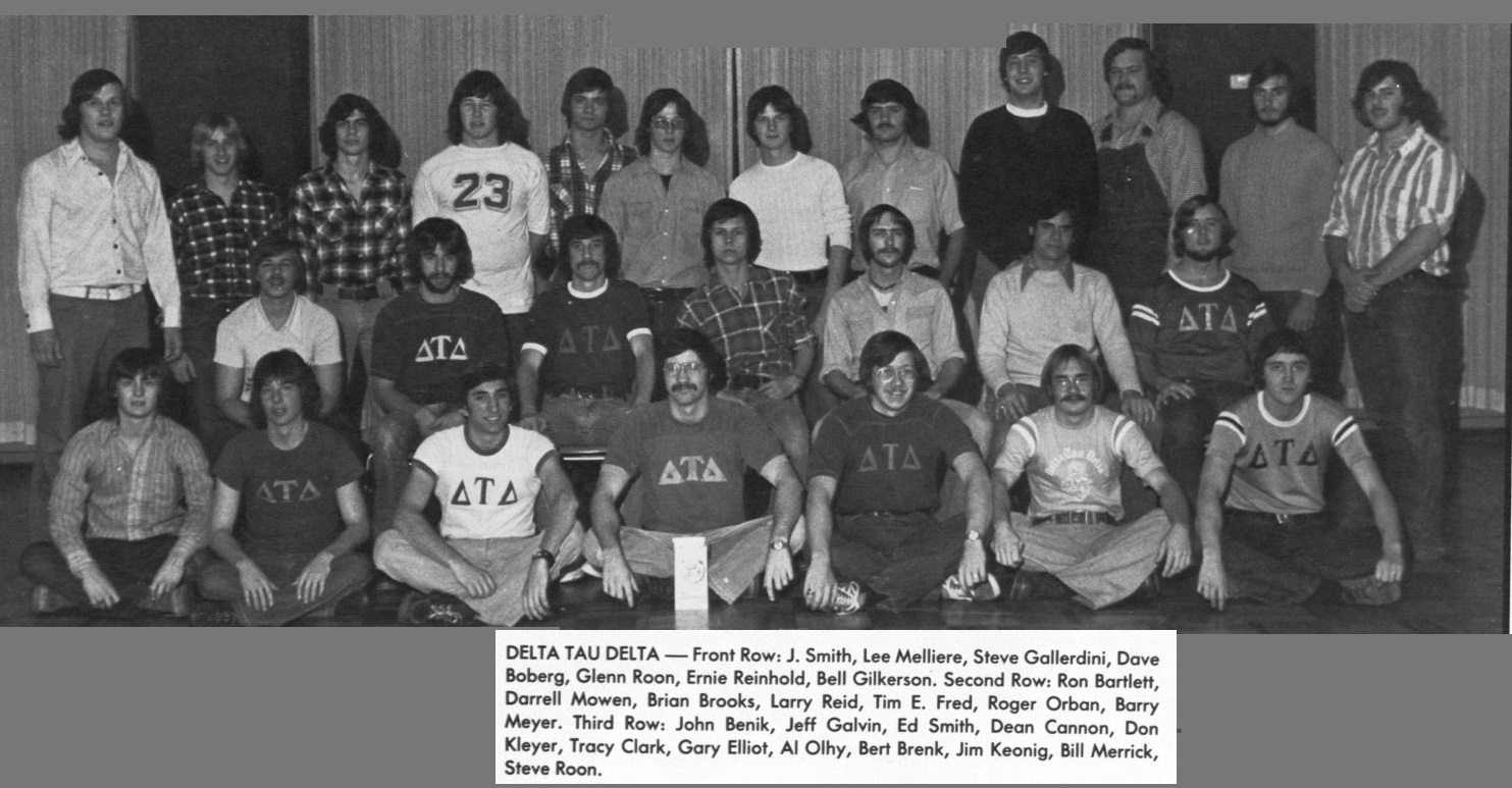 DELTA TAU DELTA — Front Row: J. Smith, Lee Melliere, Steve Gallerdini, Dave Boberg, Glenn Roon, Ernie Reinhold, Bell Gilkerson. Second Row: Ron Bartlett, Darrell Moen, Brian Brooks, Larry Reid, Tim E. Fred, Roger Orban, Barry Meyer. Third Row: John Benik, Jeff Galvin, Ed Smith, Dean Cannon, Don Kleyer, Tracy Clark, Gary Elliot, Al Olhy, Bert Brenk, Jinn Keonig, Bill Merrick, Steve Boon.