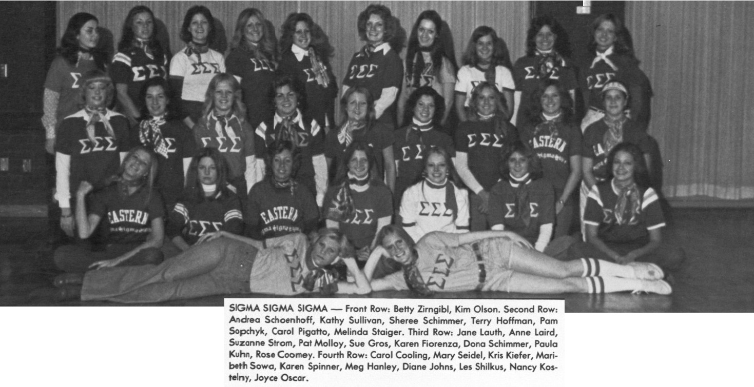 SIGMA SIGMA SIGMA — Front Row: Betty Zirngibl, Kim Olson. Second Row: Andrea Schoenhoff, Kathy Sullivan, Sheree Schinmer, Terry Hoffman, Porn Sopchyk, Carol Pigatto, Melinda Staiger. Third Row: Jane Louth, Anne Laird, Suzanne Strom, For Molloy, Sue Gros, Koren Fiorenzo, Dona Schirmer, Paula Kuhn, Rose Coomey. Fourth Row: Carol Cooling, Mary Seidel, Kris Kiefer, Moribeth Sowa, Karen Spinner, Meg Hanley, Diane Johns, Les Shilkus, Nancy Kostelny, Joyce Oscar.